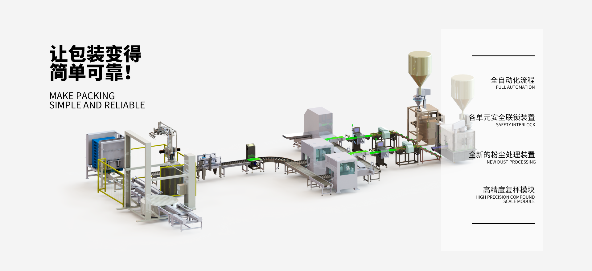 可支持10公斤、15公斤、20公斤、25公斤、50公斤至吨袋包装全自动包装生产线,可完成自动上袋、填充、计量、脱气、封口(热合/缝包/纸条)、倒袋整型、检测(金属/重量/异物)、喷码及码垛全流程,为您整个颗粒粉末包装生产周期提供技术与服务解决方案。