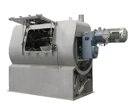 该型混合机在工作时由动力组驱动主轴旋转运行,主轴上分布若干连续的桨叶 ,桨叶成一定的安装角度,在运转时翻转物料,使物料形成上下对流的同时,进行多方向流动,能够快速达到均匀混合。