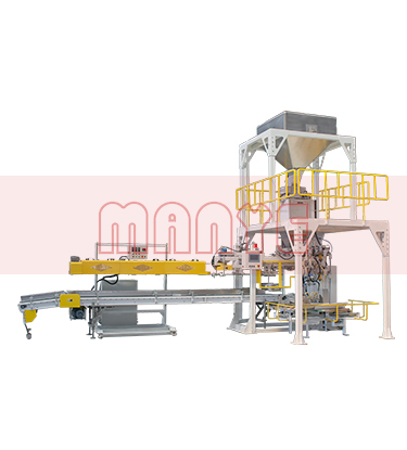 3、包装一体化:自动套袋单元完成自动吸袋、送袋、上袋、落袋、移袋的工作,与自动标签机配套运用,完成套袋、缝包全自动化。此过程中遇到夹藏失误报警并自动处理。