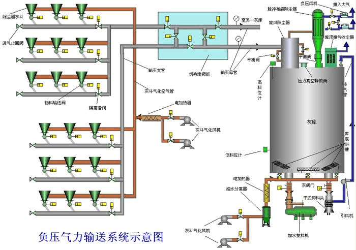 负压气力系统通常由物料输送阀、进气止回阀、输送管道及阀门、灰气分离设备、贮灰库及辅助设备、负压风机和控制系统等组成。
